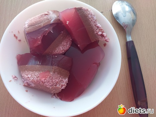 Желе по рецепту на упаковке (я с обычным желатином не умею, поэтому покупаю эти фруктовые, которые надо просто в горячую воду всыпать) там было 2 пакетика на 1 л воды