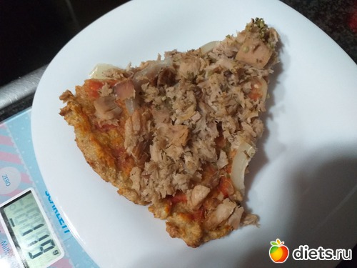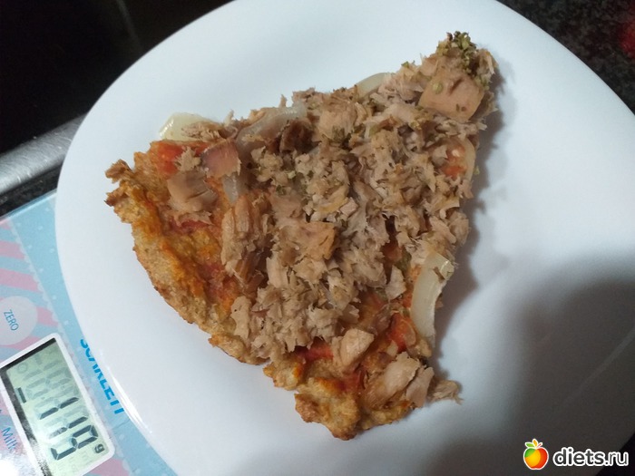 Смазать поверхность томатпастой (70 г), лук кольцами (70 г), тунец в с/с (240 г).