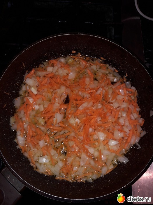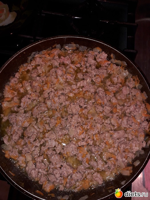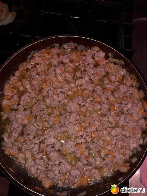Мелко порезанный лук, натертую морковь и фарш обжарьте на небольшом количестве масле-под крышкой, притушите до готовности. Во время обжаривания разбивайте комочки, посолите и поперчите по вкусу.