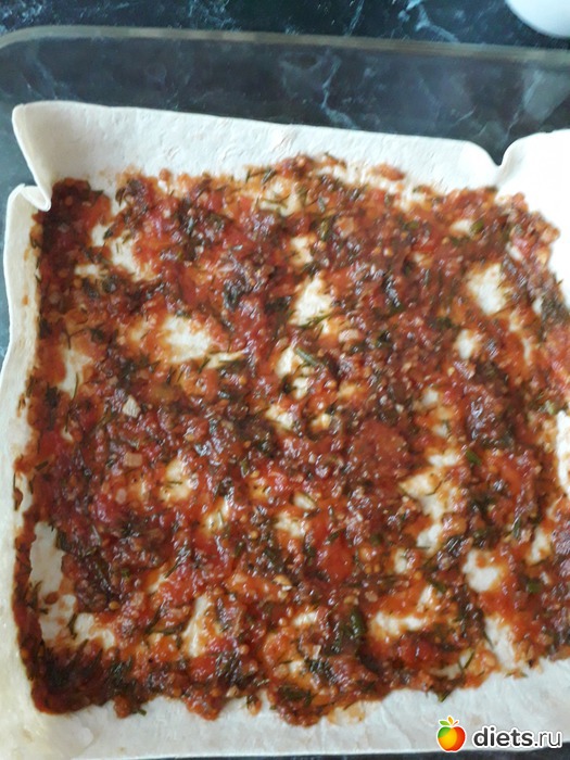 Выложите на лаваш треть томатного соуса и распределите по всему листу.