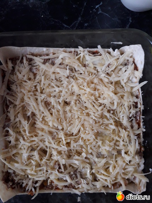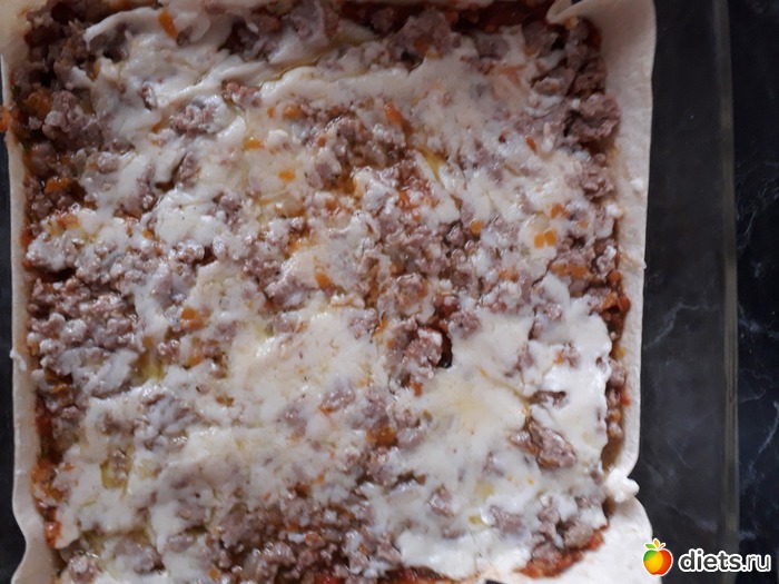 Далее накройте вторым листом лаваша и повторите слои еще разок. После бешамель накройте третьим листом лаваша, смажьте его оставшейся третью томатного соуса и посыпьте сыром