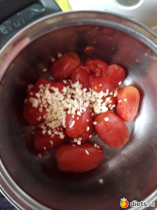 помидоры проблендерите (кожицу уберите). Перетирать через сито, чтобы убрать косточки, или нет, решать вам. Я использовала консервированные помидоры в собственном соку, убрав кожицу.