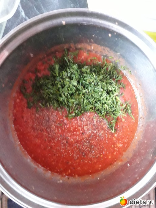 Выдавите в помидорную мякоть чеснок, перемешайте и поставьте на небольшой огонь увариться. Проблендерите! Добавьте специи и зелень.