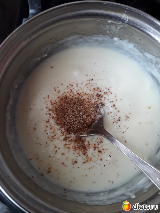 Влейте теплое молоко, добавьте мускатный орех и всё так же энергично помешивая (очень удобно мешать венчиком) сварите соус.