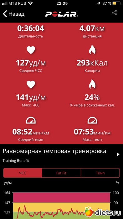Причем очень важно то, что ЧСС при этом была в пределах 130. Пришлось перебежать один перекресток на мигающий сигнал, ускорилась, ну и пульс немного подскочил.