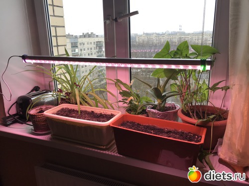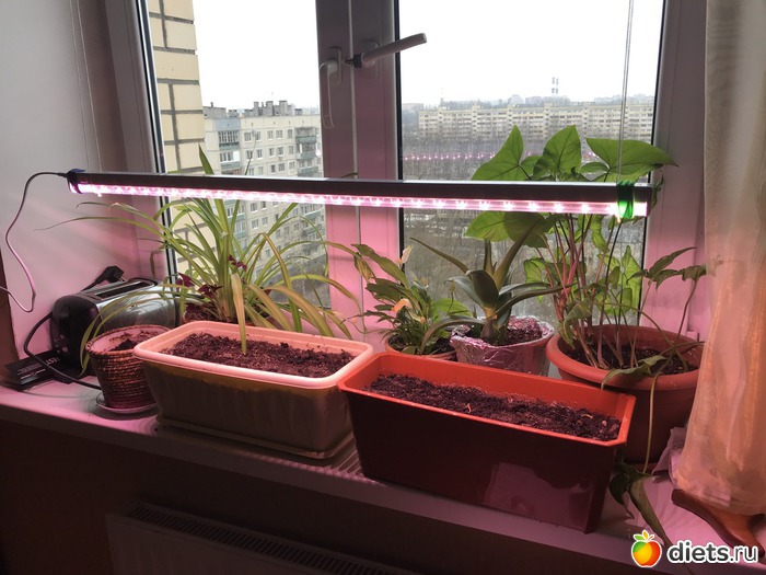 Еще сегодня повесила фитолампу. Посеяла в кашпо редиску и мангольд. Это для зеленых смузи.