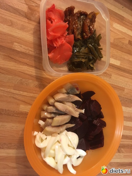 На полдник-вареная свекла с селёдкой и белками. Без морской капусты тоже жить не могу, хотя лет до 35 не очень-то ее брала, а сейчас ем каждый день. Вместе с вялеными помидорами и маринованным имбирём.