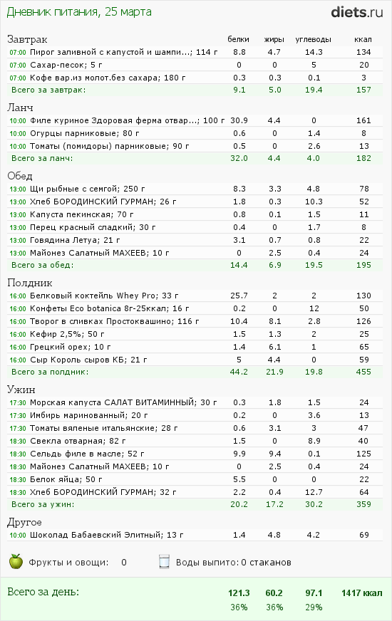 Не, не через полтора часа, это я так время набивают, от балды, иногда не замечаю, какое стояло. Постепенно соорентируюсь. Да, в обед надо добавить белка, точно, сама заметила вчера, когда писала. Если на полдник оставить только протеин, то куда запихнуть творог?! Пока не получается примерно уравнять БЖУ на все приемы. Работаю над этим. Рост 172, физической нагрузки можно сказать никакой, кроме велотренажёра (иногда не каждый день) и пеших ходок на работу и обратно 40 минут. Все подсказки приму с уважением, все тут к одной цели идём! Конечно, будем дружить, в компании-оно веселее, а иногда и грамотнее!