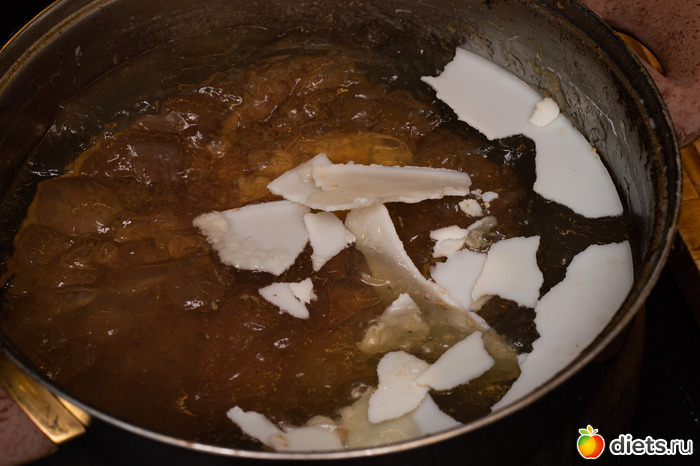 Вынимаем мясо и освобождаем от всяких перепонок и костей. Это кстати можно делать прямо руками, наше изначально жилистое и безумно жёсткое мясо после нескольких часов варки будет очень мягкое, и нежное, легко отламывается от костей, и только под конец можно воспользоваться ножом, уже для того чтобы нарезать мясо на небольшие кусочки, которые удобно брать ложкой.
