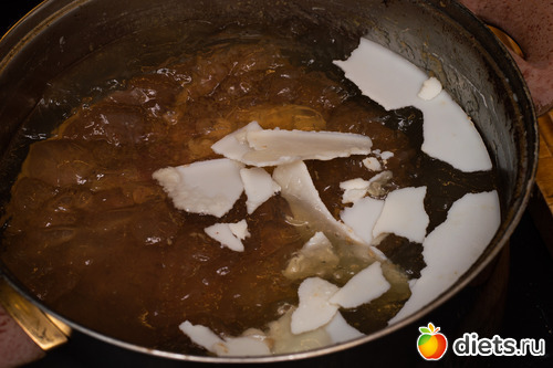 Достаём. Жир выступит этаким ледником на поверхности - если берём нежирное мясо, его будет немного, но для наших целей хватит. Вот ложкой или прямо руками его снимаем и откладываем в мисочку. Если мясо сильно жирное, или мы хотим таки добавить бекон - можно в мисочку положить часть жира, а часть жира выкинуть. Но выкидывать еду мы не любим, даже если это жир, так что сами предпочитаем просто брать нежирное мясо и не добавлять всяких беконов.