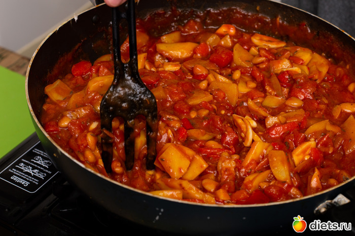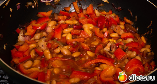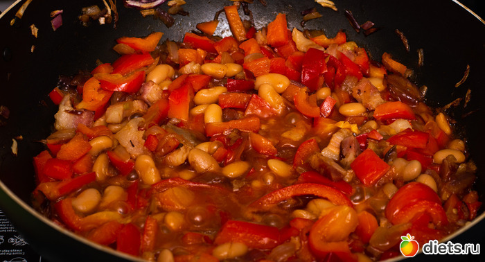 Любители фасоли или гороха добавляют всё в ту же сковородку их готовыми именно сейчас.
