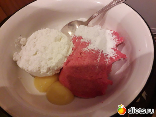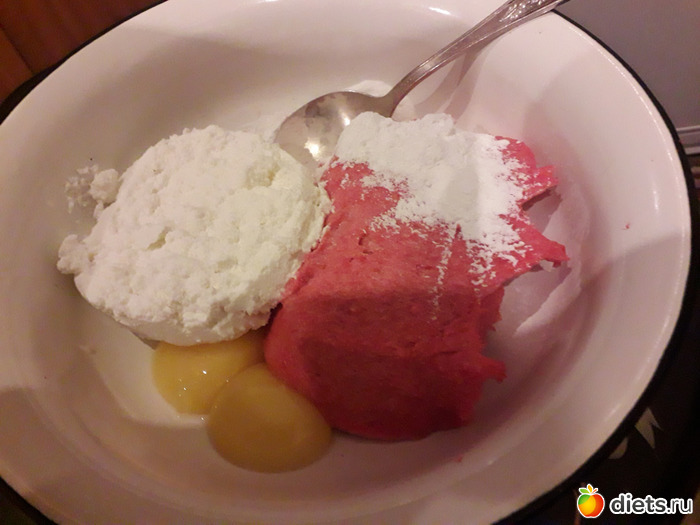 В куриный фарш добавить творог, лук, желтки, крахмал, соль, перец. Тщательно перемешать или проблендерить.