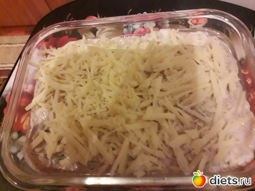 Сыр потереть на мелкой терке. Посыпать сверху и поставить запекаться в горячую духовку на 30-40 минут(все зависит от Вашей духовки). Первые 15минут выпекать под закрытой фольгой, потом ее снять и и запекать до зарумянивания.