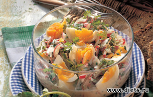 4. Нарезанный соломкой редис в большой миске смешайте с зеленью. Добавьте нарезанные яйца и соус и перемешайте. Нарежьте оставшиеся яйца на восемь частей и украсьте ими приготовленный салат.