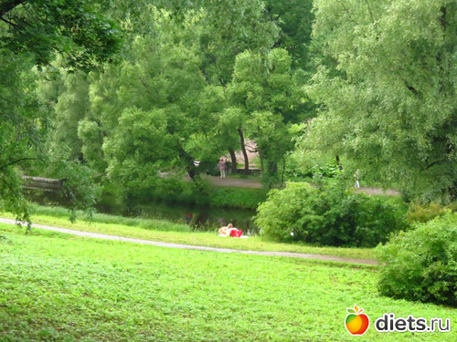 Деревья огромные, аллеи широкие и высокие, трава сочная.