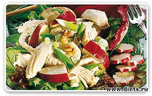2. Снимите с мяса кожицу и нарежьте его ломтиками. Вымойте сельдерей, очистите его и мелко нарежьте. Вымойте под струей горячей воды яблоко, разрежьте его на четыре части, удалите гнезда, а остальное нарежьте ломтиками, не снимая кожицы.