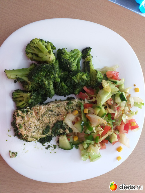 Обед: лосось в маринаде (покупной, жуть калорийный, кто купил - конечно, Адриан), овощи запеченные, салат из свежих овощей