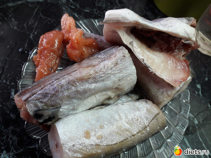 Минтай-тресковый какой-то.Это Гриша в нашем магазине Красная Икра покупал.Он-с Камчатки.Уже без головы,но в брюхе оставлена икра,кишки вычищены.Я писала про эти шикарные магазины у нас.Там все с Камчатки и Мурманское с плавбаз!Все в вак/упаковке-и крупный ,вот в 3 штуках(1 хвост оставили усатому-полосатому,иногда даю ему,хотя кастратам и нельзя!Но просит и даю немного.Уже старенький,всю жизнь по чуть-чуть даю )больше 1.2кг.Это без головы ведь!