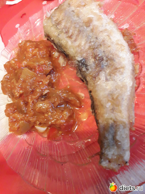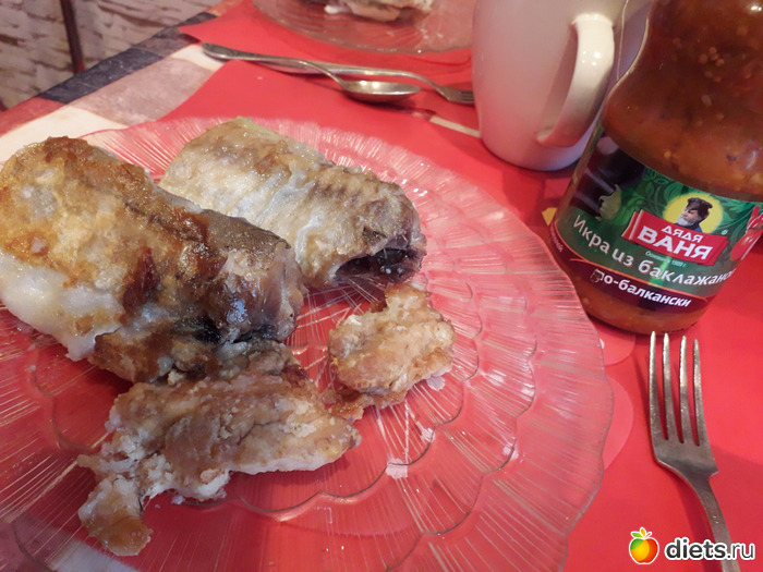 -ЖАРЕНЫЙ МИНТАЙ, БАКЛАЖАНОВАЯ ИКРА, ЧАЙ