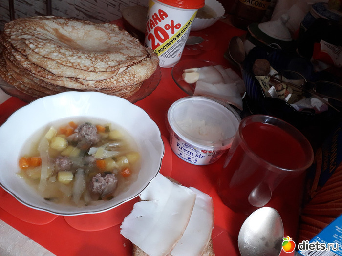 -ЩИ С ФРИКАДЕЛЬКАМИ, БЛИНЫ, БУТЕРБРОД С САЛОМ, КОМПОТ