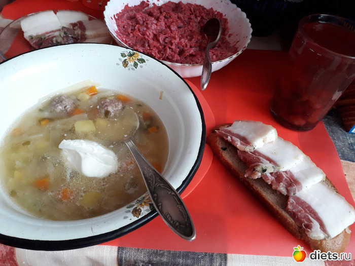 -ЩИ С ФРИКАДЕЛЬКАМИ, САЛО, СВЕКЛА С ЧЕСНОКОМ И ГРЕЦКИМИ ОРЕХАМИ, КОМПОТ