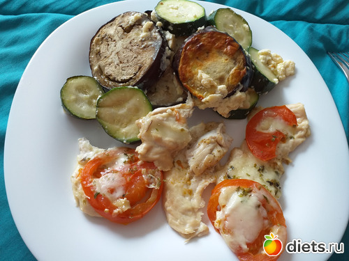 Обед: курогрудка и овощи запеченные с йогуртом и моцареллой