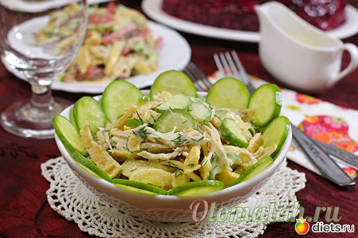 Редко кто угадывает что же такое добавлено в салат, так что даже любителей необычных вкусовых сочетаний можно удивить таким простеньким по составу салатом. Для сытности в салат добавляют любые мясные продукты, в нашем варианте это отварное куриное филе, разобранное на тонкие волокна. Можно заменить его любой колбасой или ветчиной, отварным мясом. Свежий огурчик тоже очень кстати – он добавит салату сочности и свежести.