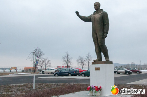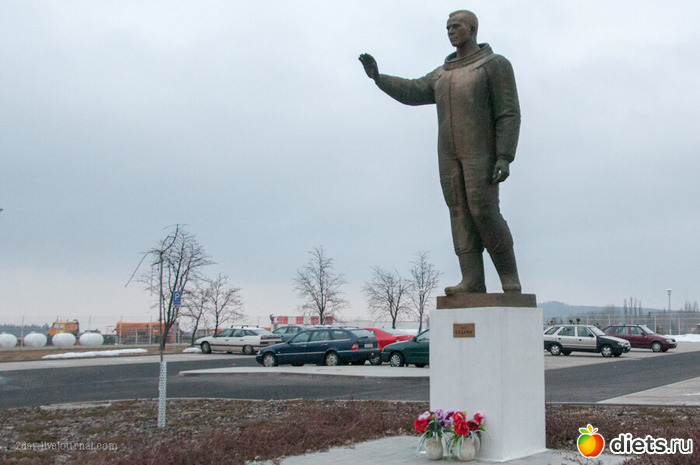 В 1992 г. скульптура в связи с неуместностью местоположения была перенесена на площадь перед Карловарским международным аэропортом. Монументальный бронзовый памятник высотой 320 см изображает космонавта Юрия Гагарина в серебряном скафандре