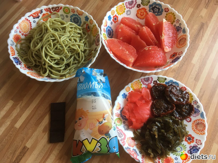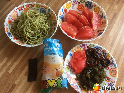 Шпинатные спагетти с морской капустой, маринованным имбирём и вялеными помидорами на обед