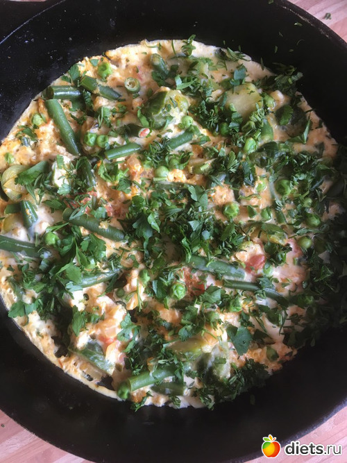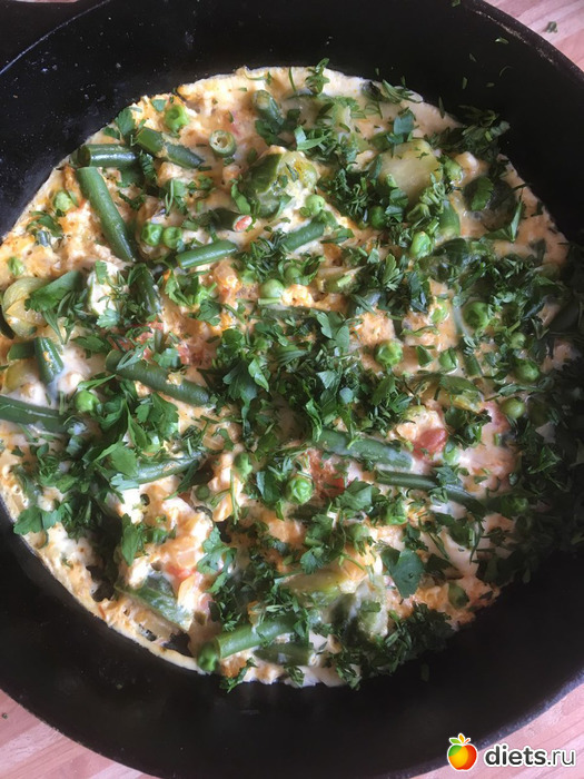 Смешала два яйца, четыре белка и НеМолоко, и этой смесью залила брюссельскую капустку, горох, томаты в собственном соку и стручковую фасоль. Приправила специями: зира, аджика и чеснок сушёный. Все щедро посыпала свежей зеленью. Красота... Читать полностью