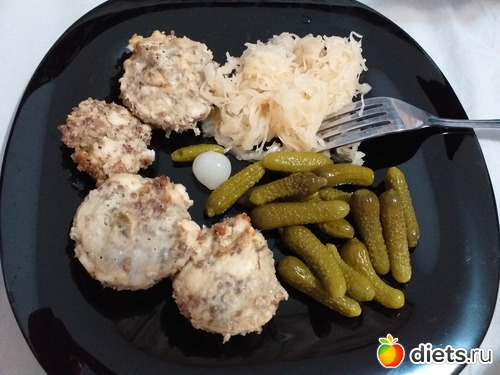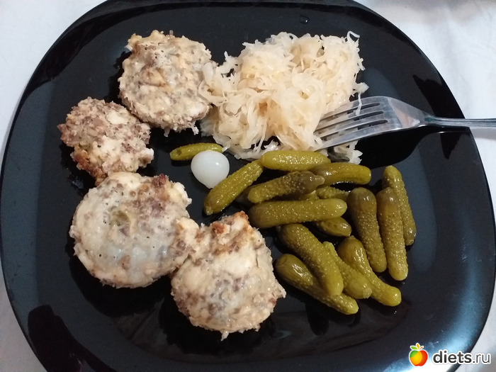 Обед: куриные котлеты, огурчики маринованные, капуста квашеная
