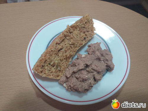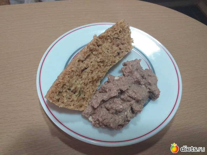 Перекус: хлеб (отруби, яйцо, разрыхлитель, немного творога), паштет (печень куриная, яйцо, лук, сыр Бургос) госпадекаквкусната