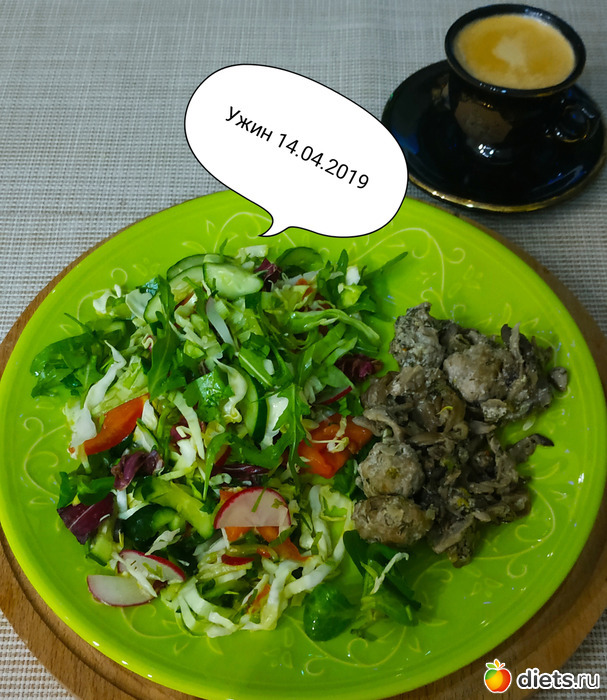 Салат 150 г из свежих овощей заправленный солью и 1 чайной ложкой оливкового масла (у меня овощи: молодая белокочанная капуста, руккола, радичио (салат), огурец, помидор, укроп, петрушка, зеленый лук, редис, )