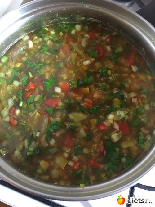 Решила сегодня супчиком побаловаться, вчера вечером варила. Получился, конечно, дико малокалорийный, всего 11ккал на 100граммов, потому что без картошки и без зажарки. Просто горяченького захотелось.