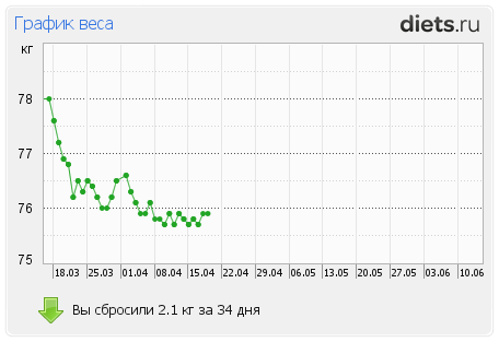 Типичный вес недели (ТВН)- 78 кг, 77,2 кг, 76,3 кг, 75,8 кг, 75,8кг: снижался -800г, -900г, 0г, -500г, 0кг.