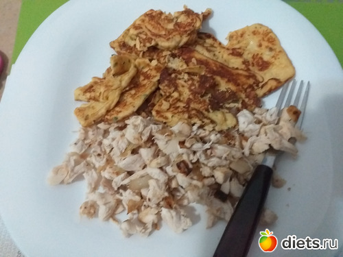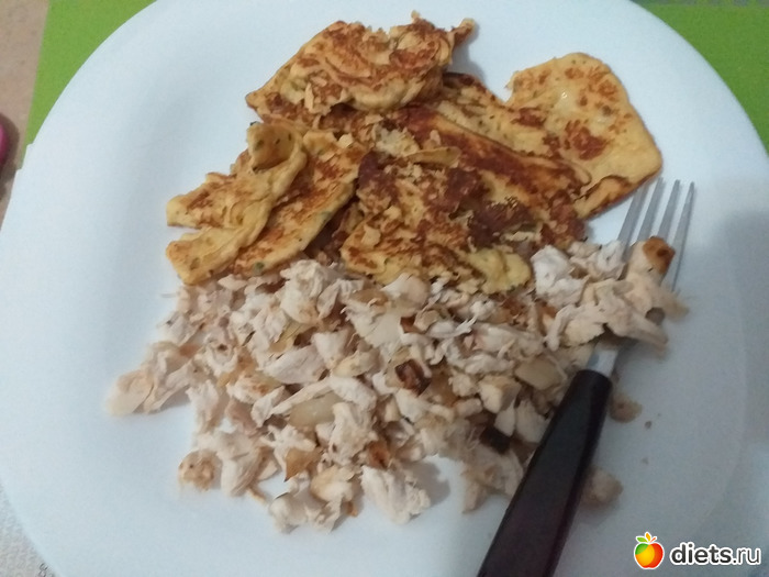 Ужин: курогрудка варёная, обжаренные с луком, то, что должно было стать лавашом (яйцо, немного творога, глютен)