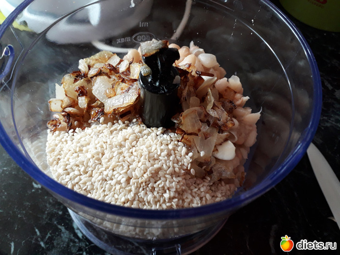 В вареную фасоль добавить поджаренный лук, чеснок, кунжут, зелень и измельчить в блендере. Если паштет получается очень густой, то добавьте немного воды от сварившейся фасоли.