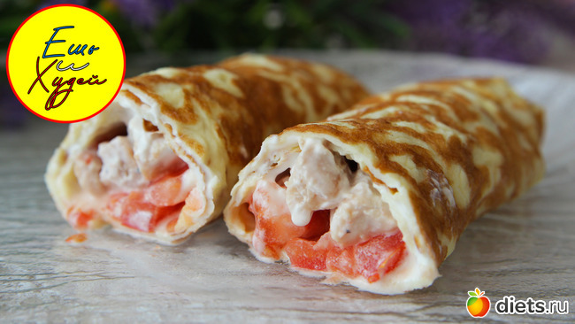 Яичный блинчик хорошо промазываем сметанным соусом, выкладываем куриное филе и кусочки томатов, аккуратно заворачиваем в рулетик.