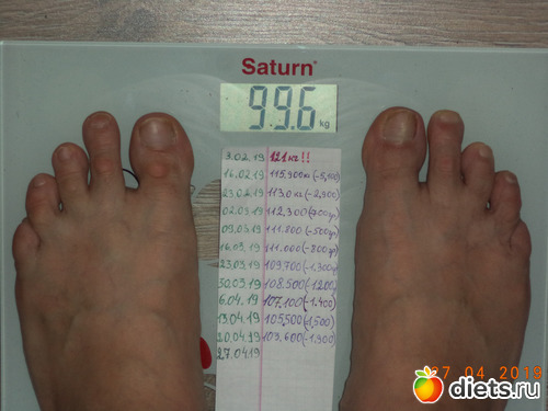 ДЕНЬ 82 Начну с ОЧЕНЬ радостной новости для меня!! Сегодня было как всегда контрольное взвешивание и... 99.600!!! ( фото прилагаю) Девочки вес уже не трехзначный!! а две циферки!!! УРА!!! ДВЕ!! ДВЕ!!! Я достигла своей второй маленькой цели в 100кг ( даже меньше- 99.600!!) Отвес большой в 4 кг за неделю... и за все время то есть за 3 МЕСЯЦА - 21 КГ!! Я ооочень довольна!! Радости нет предела...