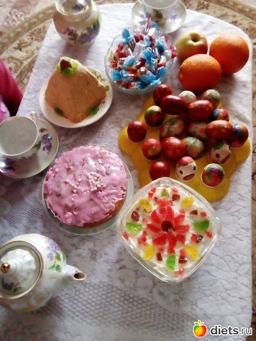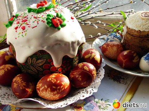 В праздник Пасхи начинается разговление после длительного Великого поста, и главными атрибутами праздничного стола являются крашенные яйца, кулич и пасха (сладкое блюдо из творога с изюмом). Крашенное яйцо (раньше — это были только красные яйца) — символ мира, обагренного кровью Иисуса Христа и через это возрождающегося к новой жизни. Кулич (высокий хлеб из сдобного теста) — символ тела Господнего, к которому должны причащаться верующие. Кстати, вся эта пасхальная еда освящается в церкви накануне — в Страстную субботу.
