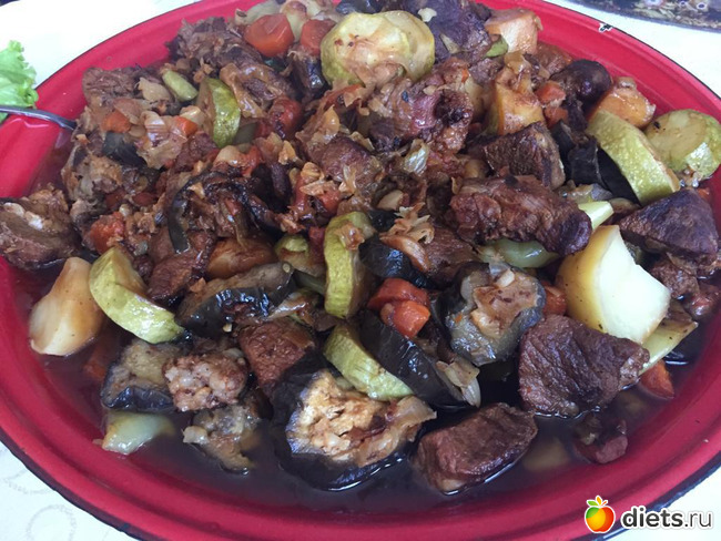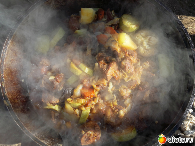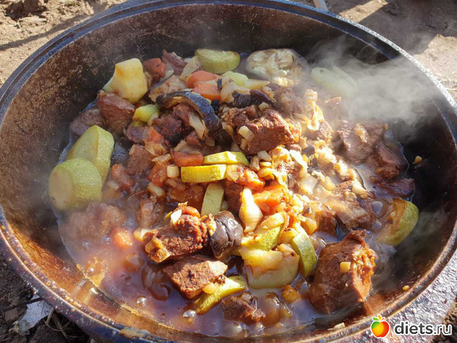 И уж потом поехали в гости к брату. Подъехали и его друзья. В принципе, они уже и наши друзья. Был брат снохи с детьми. Погода была классная. Тепло, солнышко. Настоящее открытие сезона. Барбекю не делали, а брат сделал своё фирменное блюдо: мясо в овощах, тушёное в казане на открытом огне (во дворе).