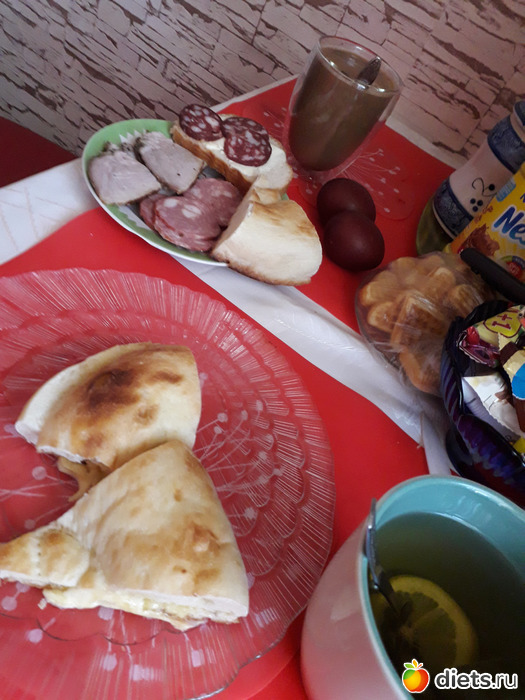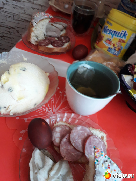 -ЯЙЦО, КУЛИЧ, ТВОРОЖНАЯ ПАСХА, БУТЕРБРОДЫ, ЧАЙ С ЛИМОНОМ