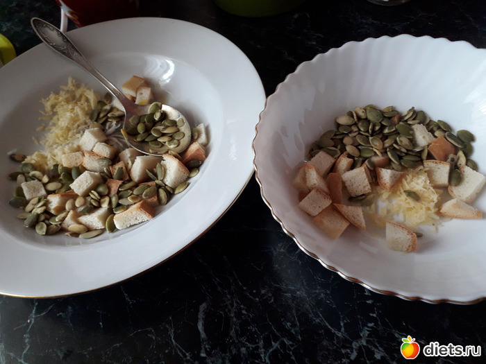 (СУП НАЛИВАЕМ В ТАРЕЛКИ С СЫРОМ, ТЫКВЕННЫМИ СЕМЕЧКАМИ, СУХАРИКАМИ)