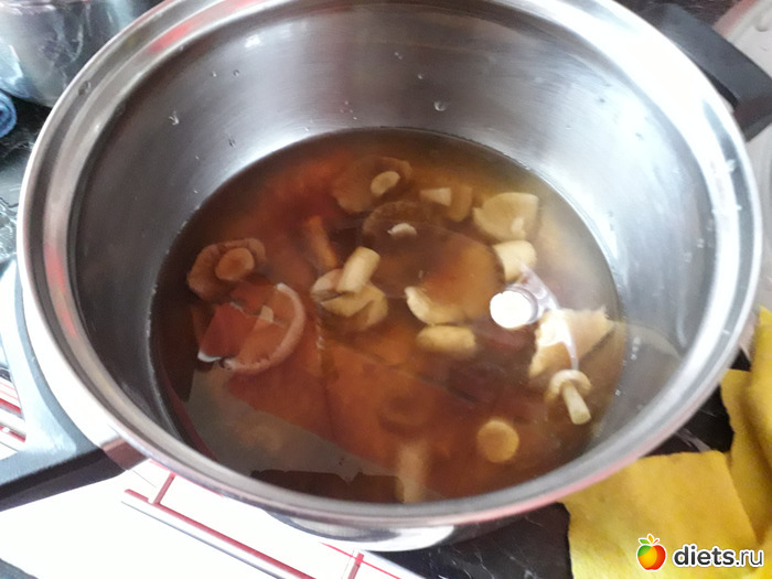 В этот раз варили с замороженными проваренными, маленькими сыроежками.