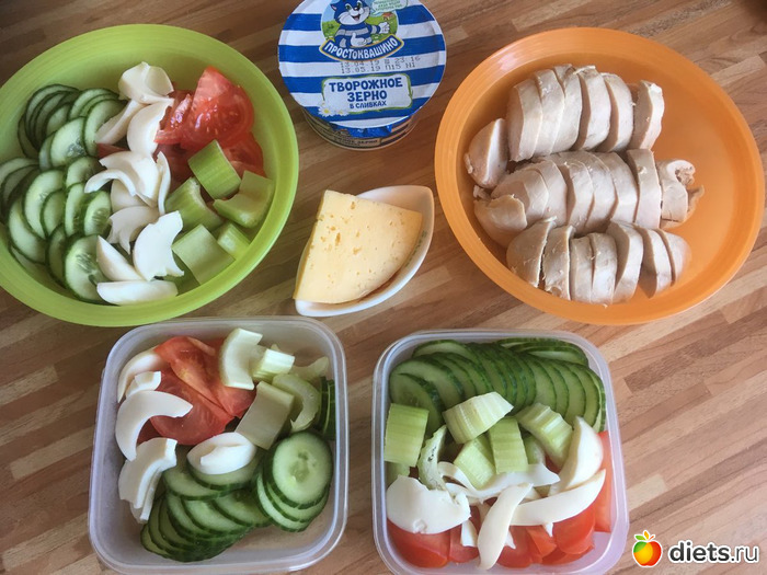 Меню самое простое, для меня, можно сказать, классическое: вареная курица и овощи.