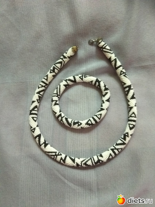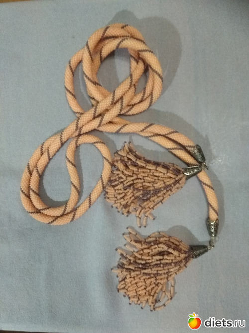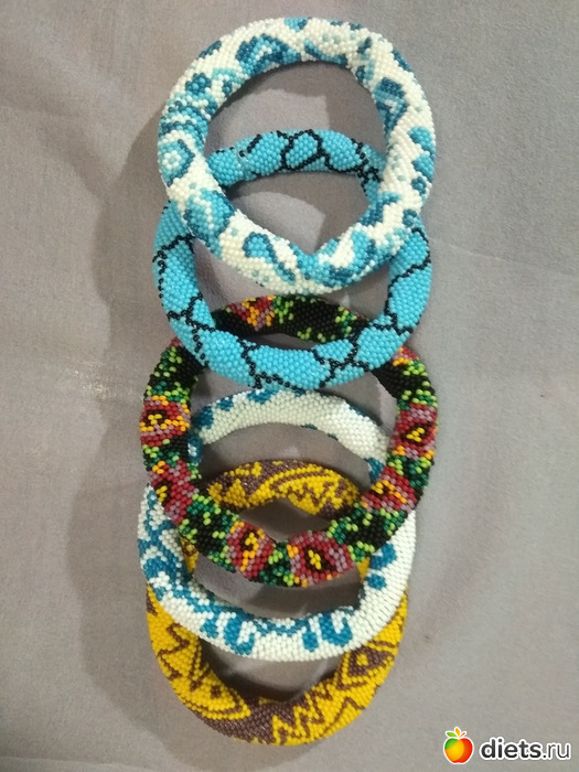 А жгуты делать очень просто - нанизывание бисер на нить (я использую "Ирис") и вяжете крючком полустолбиком по кругу, оставляя бисер снаружи. Самая большая сложность нанизать бисер по цвету для рисунка и не ошибиться.