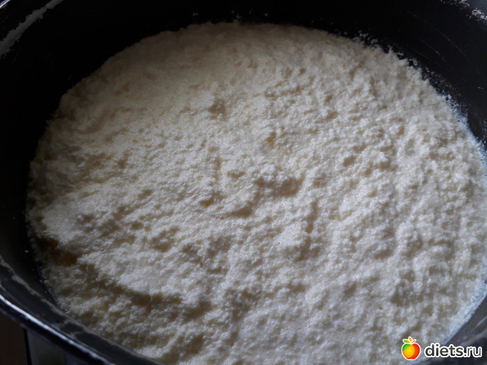 Когда смесь закипит, варим на среднем огне еще1- 2 минуты, постоянно помешивая, до отделения сыворотки. Не переварите! Не перекладывая, дадим остыть этой массе..