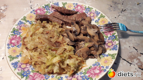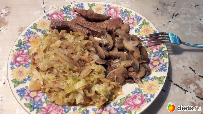 Сегодня говядина бушеная, тушеная капустка и грибочки обжаренные с лучком