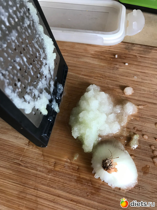 второй секрет! Для того, чтобы фарш был сочным, особенно, если вы не добавляете в него сала, некоторые хозяйки разводят его водой. Я же тру лук на самой мелкой терке! Чтобы луковица в процессе не развалилась, очищайте ее так, чтобы сохранился кончик с корешками.
