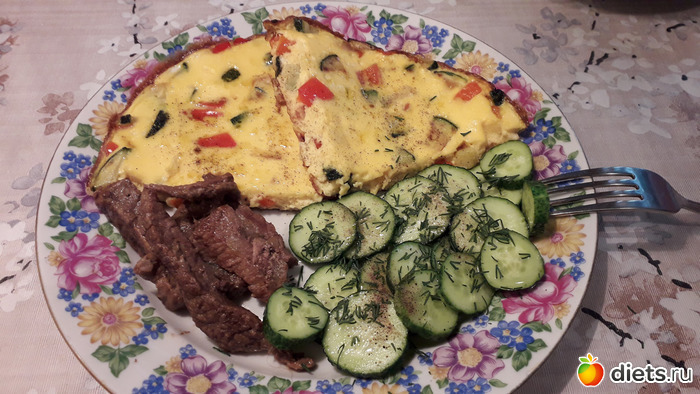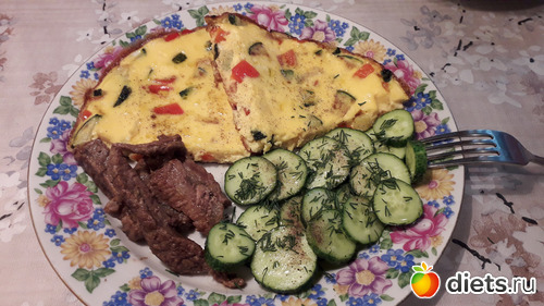 Сегодня это омлет из 3-х яиц с цуккини+перчик, говядина тушеная, огурчик свежий.